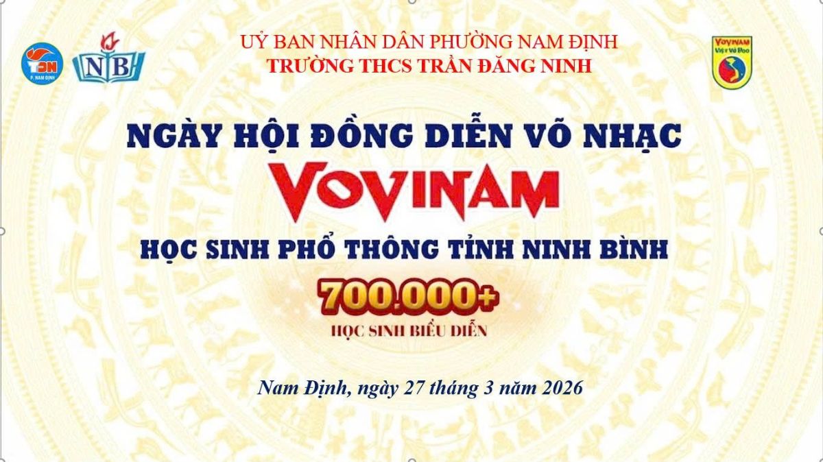 Thực hiện công văn số 520/SGDĐT-CTHSSV ngày 03/3/2026 và công văn số 784/SGDĐT-CTHSSV ngày 23/3/2026 của Sở GD và ĐT tỉnh Ninh Bình, hôm nay ngày 27/3/2026, trường THCS Trần Đăng Ninh long trọng tổ chức Chương trình đồng diễn Ngày hội võ nhạc Vovinam. Đây không chỉ là một hoạt động thể thao mà còn là ngày hội của tinh thần đoàn kết, ý chí và khát vọng vươn lên của tuổi trẻ học đường, chào mừng thành công của cuộc Bầu cử đại biểu Quốc hội và HĐND các cấp nhiệm kỳ 2026-20231, chào mừng 80 năm Ngày Thể thao Việt Nam (27/3/1946 – 27/3/2026).